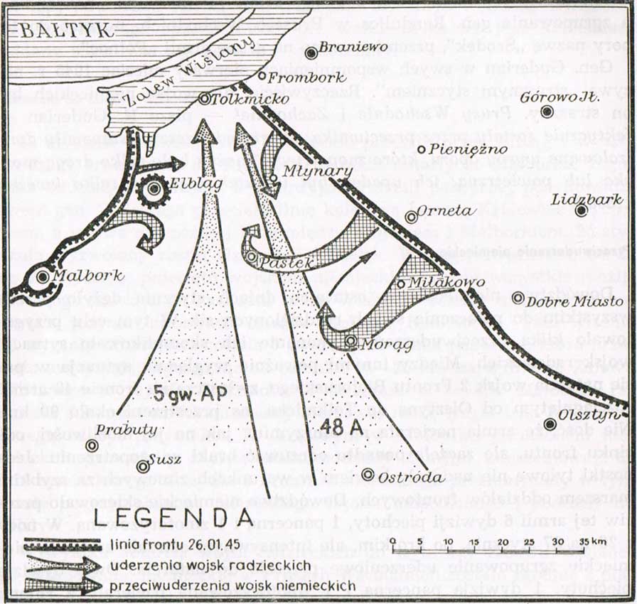 Przebieg frontu w drugiej połowie stycznia 1945r. Źródło: E. Kosiarz, “Wyzwolenie Polski Północnej 1945″, Gdynia 1967.